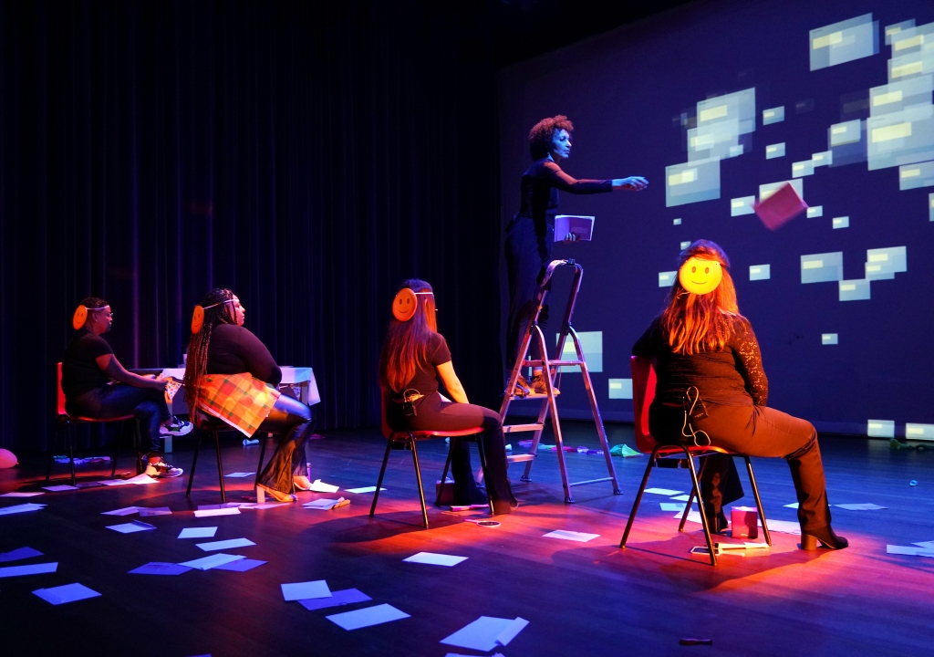Van de vijftien deelnemers aan het traject, zie je vijf dames op het podium en twee op het scherm. De verhalen die zij vertellen, zijn de eigen ervaringen van de deelnemers. Voor de meeste van hen was het de eerste keer dat zij hun verhaal vertelden. Nu doen zij dat op het podium voor publiek persoonlijke verhalen in een theatrale setting.